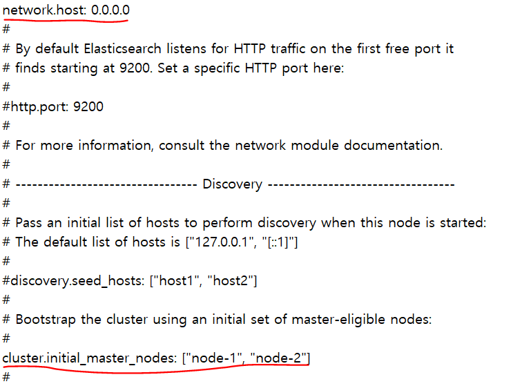 elasticsearch.yml 파일의 network.host 를 0.0.0.0으로 변경하고 cluster.initial_master_nodes의 주석을 풀어준다.